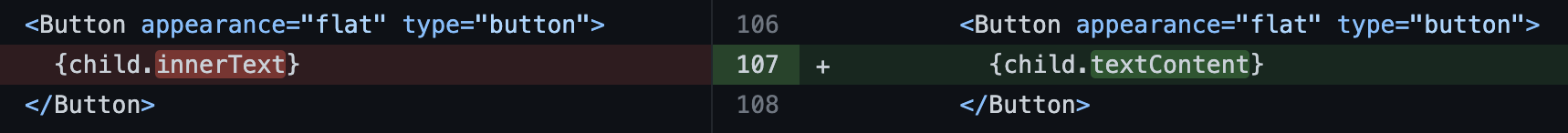 위와 같은 프로세스로 문제의 원인을 파악한 후, 저희 팀에서는 innerText를 대체하기 위해 textContent를 사용하기로 결정했습니다.