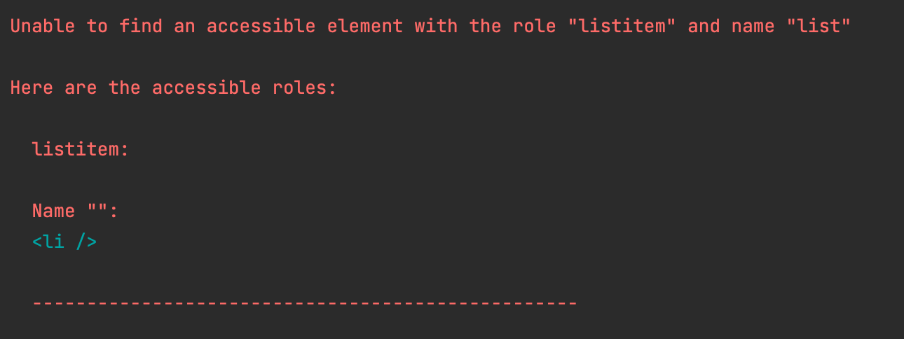 다만 위 규칙을 대략적으로 숙지한 상태에서도 테스트를 하다 보면 접근 가능한 이름의 계산이 생각한 대로 이뤄지지 않는 경우가 종종 발생하는데, 대표적으로는 role="listitem"을 사용하는 <li> 태그가 있습니다.