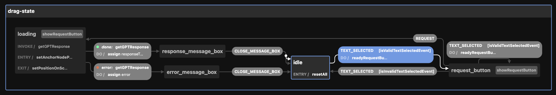컨텐츠 스크립트 코드는 리액트로 구현되었는데, 상태에 따른 컨텍스트의 얽힘이 코드의 가독성을 매우 떨어뜨렸다. 코드 정리를 위해 어떤 패턴을 써볼까 고민하다가 이번 기회에 게임 개발에 많이 사용되는 유한상태기계(FSM) 패턴의 JS/TS 구현체인 XState를 사용했다. 결론부터 말하자면 굉장히 만족도가 높았다.
