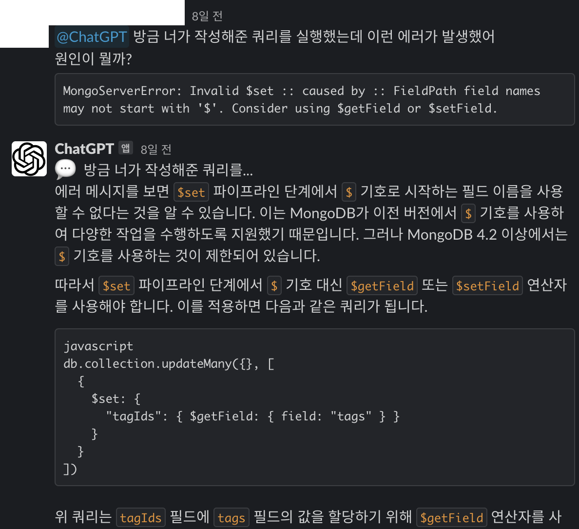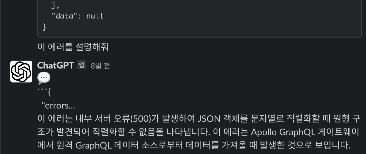 사내 슬랙에 ChatGPT 봇을 만들어서 배포한 이유도 그러한 마음에서였다. ChatGPT에 쓰이는 언어 모델에 요청하기 위한 api도 이미 공개가 되어있고, 호출 자체도 간단하기 때문에 후딱 만들어서 배포했다.