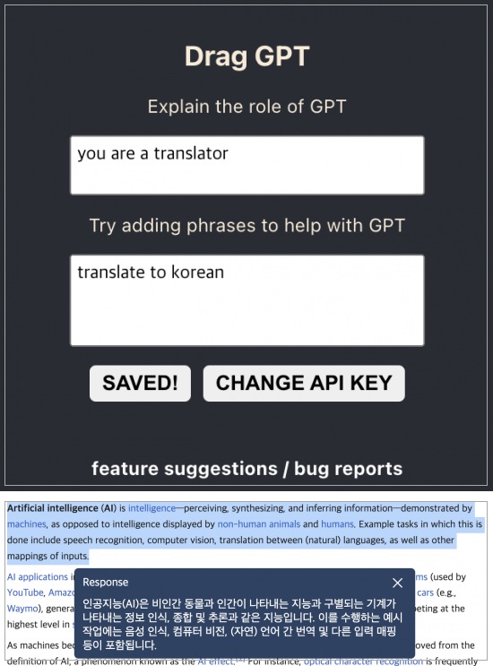 드래그 후 버튼 클릭만으로 간단하게 선택한 내용을 ChatGPT에게 물어보거나 요청할 수 있어요!