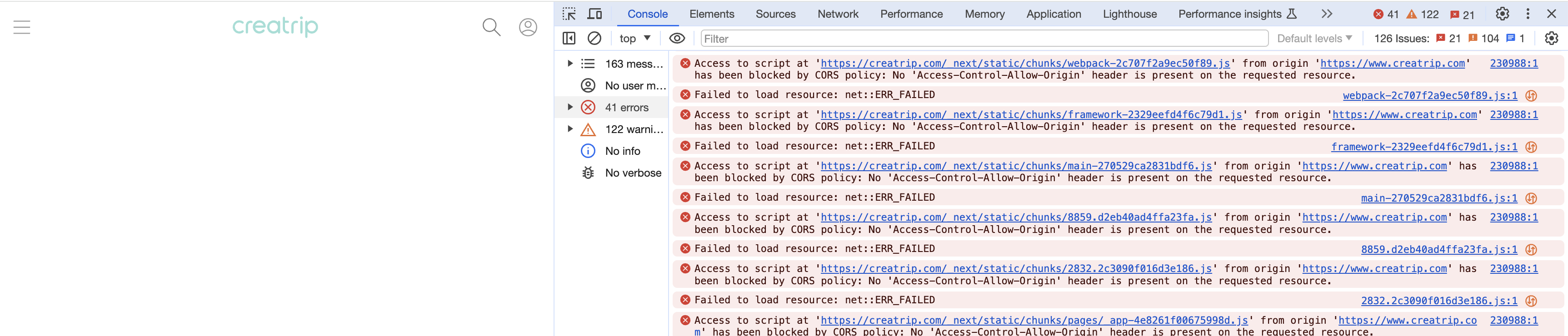 금일 정기배포 이후 www.creatrip~ 에서 요청하는 js chunk 파일에 대한 CORS 에러가 발생했다.