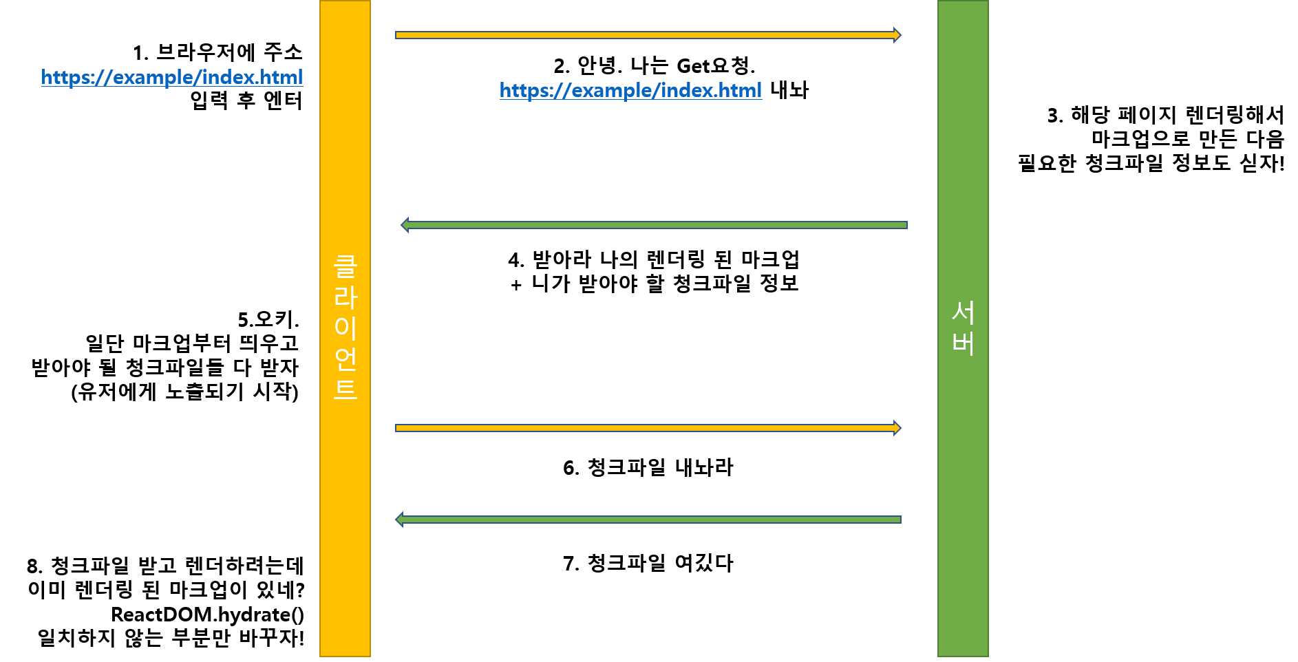 클라이언트에서 렌더링 과정을 다시 거치면서, 만약에 이미 서버에서 마크업 된 노드가 있다면 ReactDOM.hydrate()로 바뀐 부분만 새로 렌더링 한다.