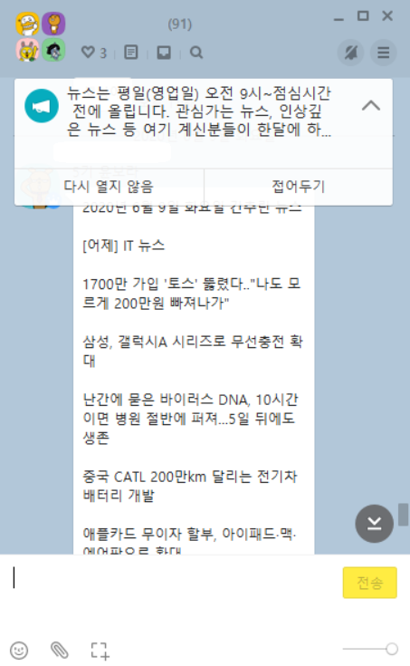 4.매일 업데이트 된 뉴스를 편하게(?) 가져와서 채팅창에 올림(?)